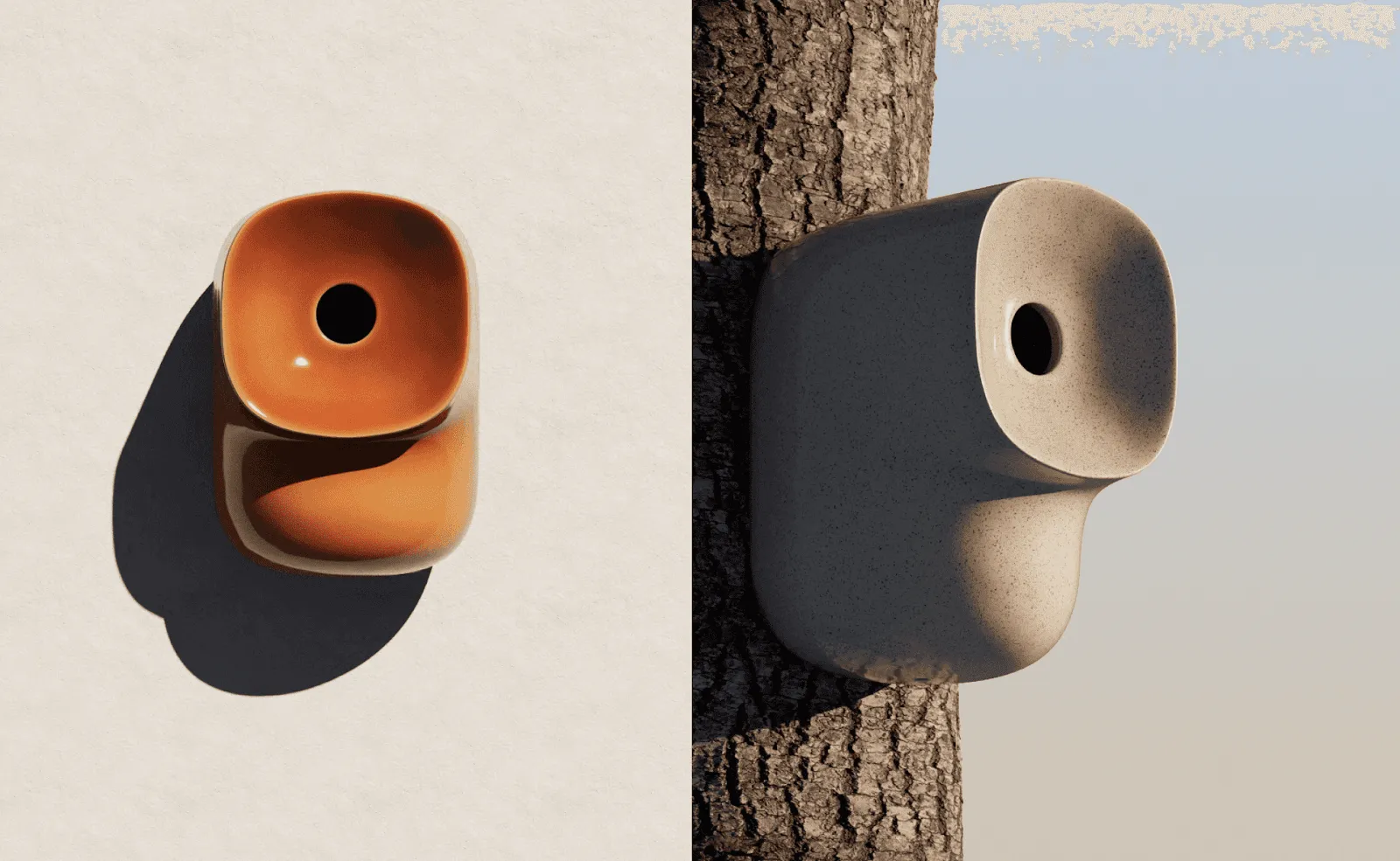 Honorable mentions include:(From left to right) Carton Feeder by Chris Ference, Big Bird by Matthew Hanzly, Plastic Bird Habitation System™ by Philipp / Studio Cool Berlin, Ripplecrest by Felixander Yuan, Pulp Nests by Carson Porter-Keese, Solari Bird House by Yelyzaveta Spitsyna, & Stacker Birdhouse by Thomas Mahota