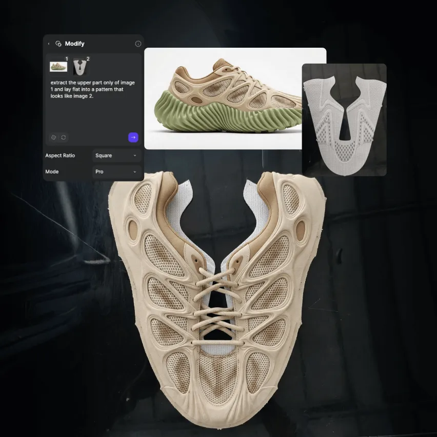 Turn sketches into lifelike footwear concepts in seconds.