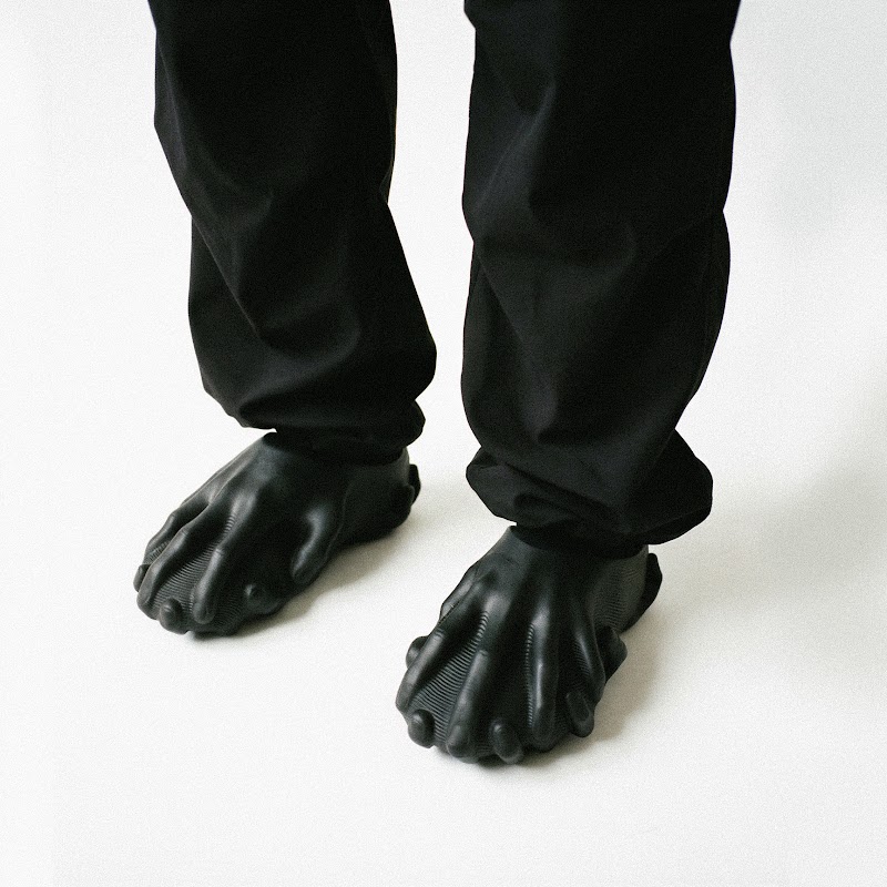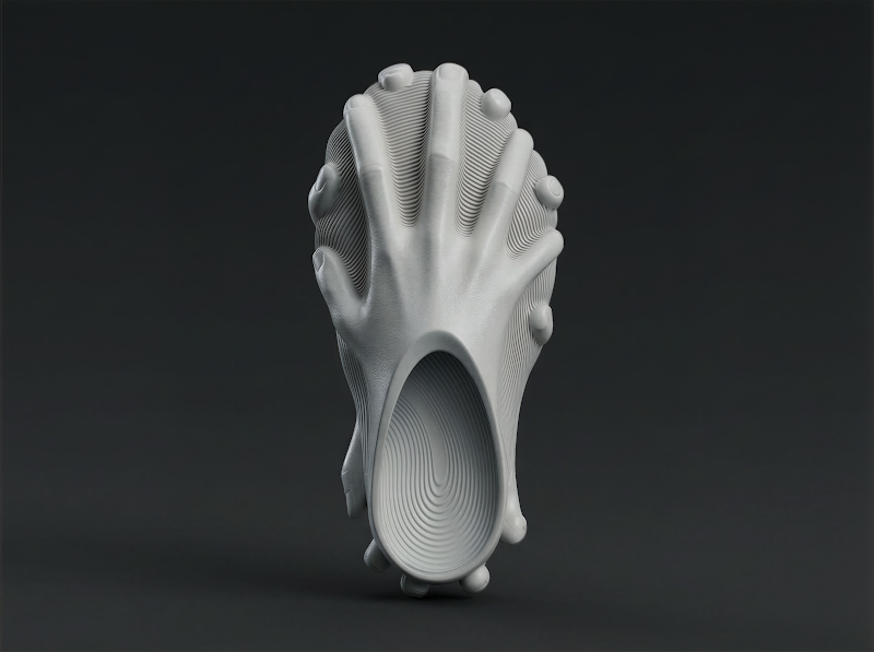 A form of human hands creates a structure around the foot. The insole pattern resembles a fingerprint, and similar ridges fill in the rest of the form. For a while, AI was scrutinized for an inability to represent hands, this design showcases AI's advancements since then through a form most achievable with 3D printing.