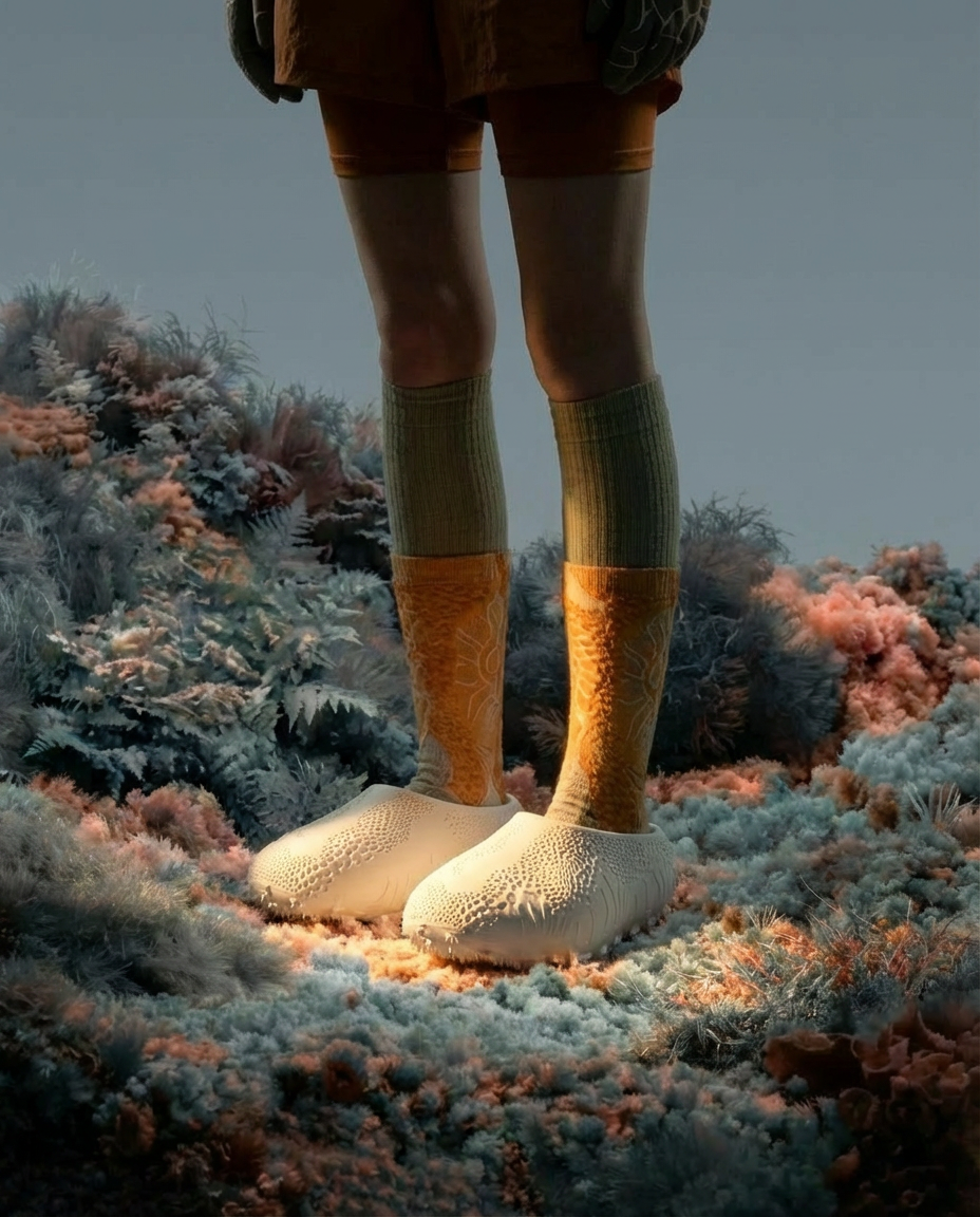 I wanted something with a strong bulbous silhouette so it wears as a cozy mule, top view reads as a subtle half circle so when in a pair it finishes the circular shape. The puffer fish inspired the natural patterns that gradually stretched into the spiked treads at the bottom. The story of how its displayed is underwater hiking inspired, so it touches on Vizcom's ability to push story telling in impossible environments.