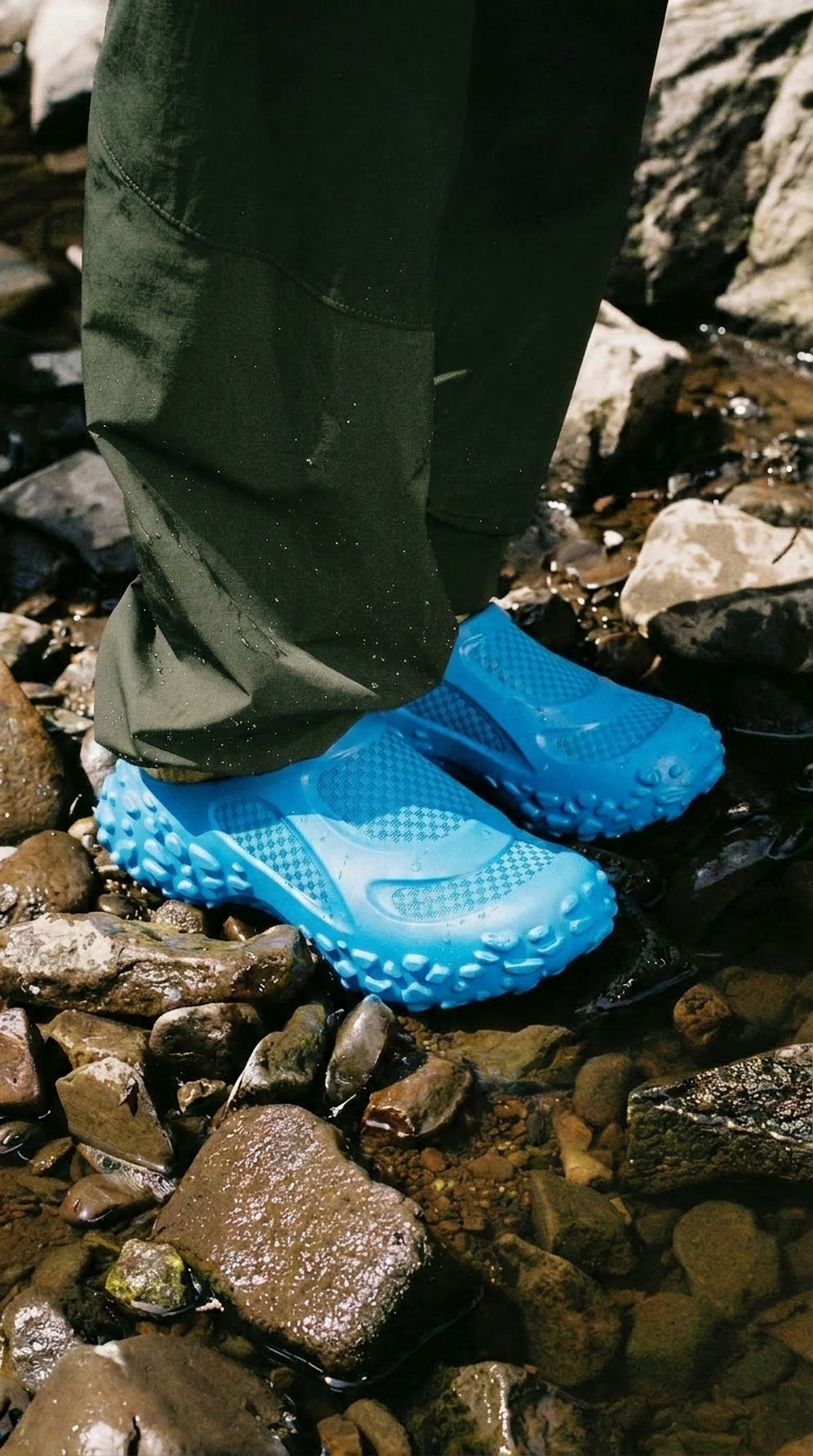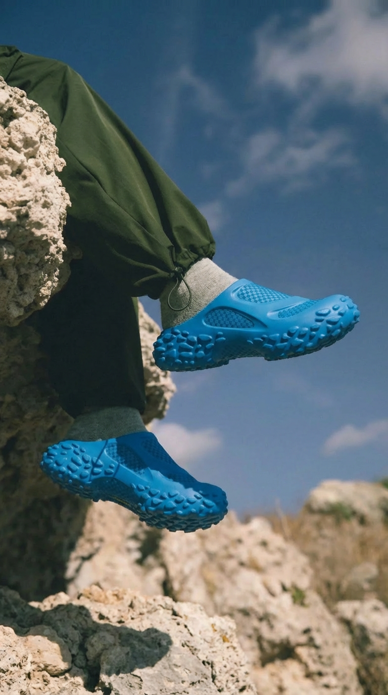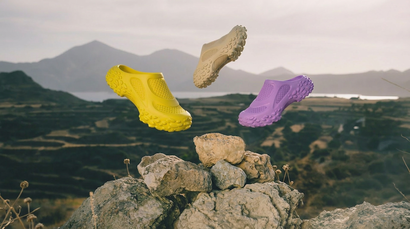 A rugged sculptural approach to the mule architecture. The shoe you put on after the exploration while still in the outdoors. Capable and confortable
