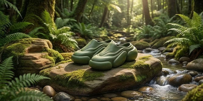 LITHOS reimagines a hiking runner as a mule, translating an outdoor silhouette into an easy slip-on form. The upper stays smooth and sculptural, while large segmented lugs give the sole a bold, rock-like presence that grounds the entire design.