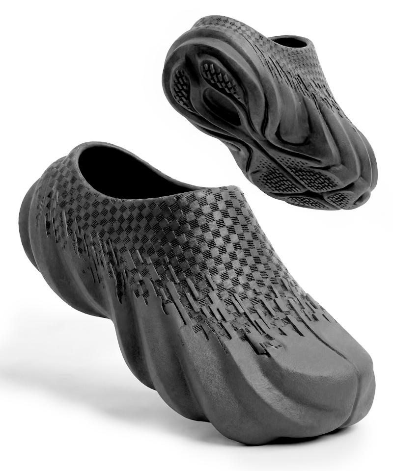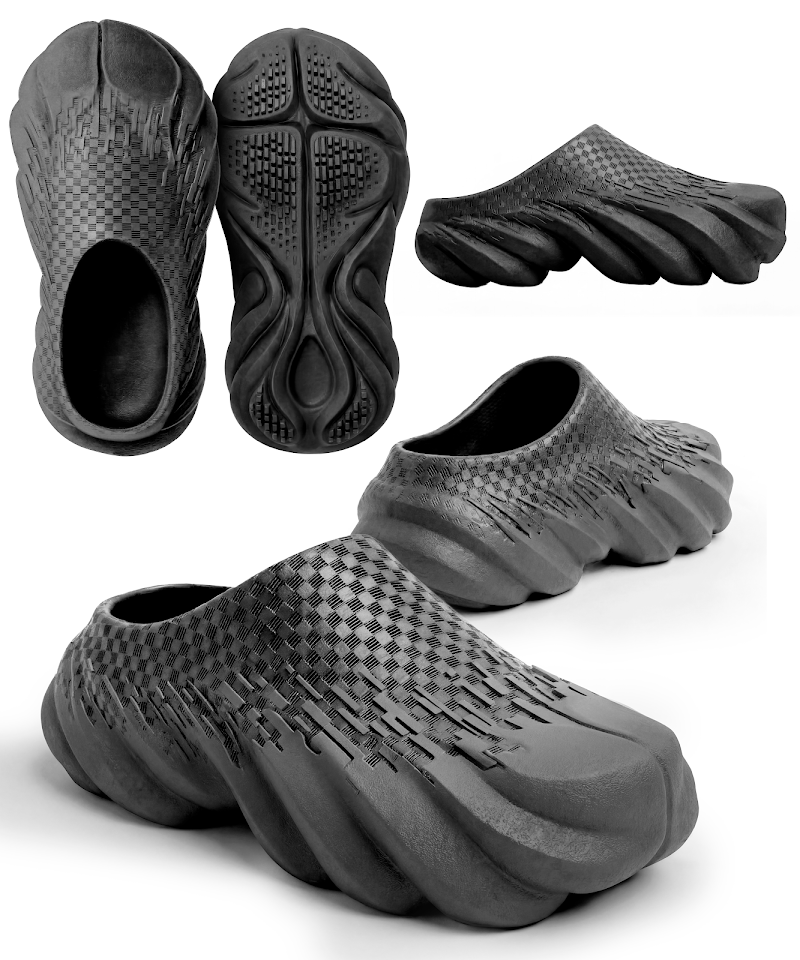 This mule is built as a monolithic form inspired by aeolian topography, translating displacement, compression, and accumulation into one continuous wearable volume. The upper and sole flow together through a series of ridges that repeat with variation, creating rhythm, directional movement, and a balanced distribution of mass across the silhouette. Even with its dense and grounded presence, the geometry is meant to feel like temporary topography, shaped by forces in motion rather than by a fixed and static condition.