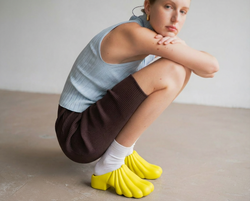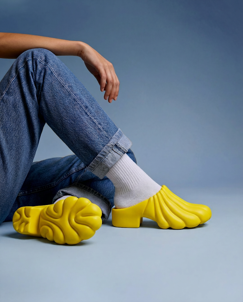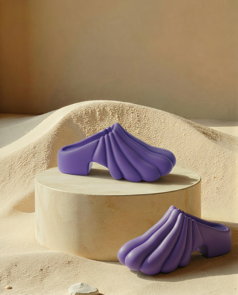 The inspiration for this project began with the organic geometry of a seashell, viewing the shoe as a protective, natural layer for the foot. While the silhouette is rooted in the sea’s forms, the final design translates these lines into a voluminous inflated aesthetic. This approach transforms a natural motif into a bold fashion statement, balancing nature's softness with a strong, modern silhouette.
