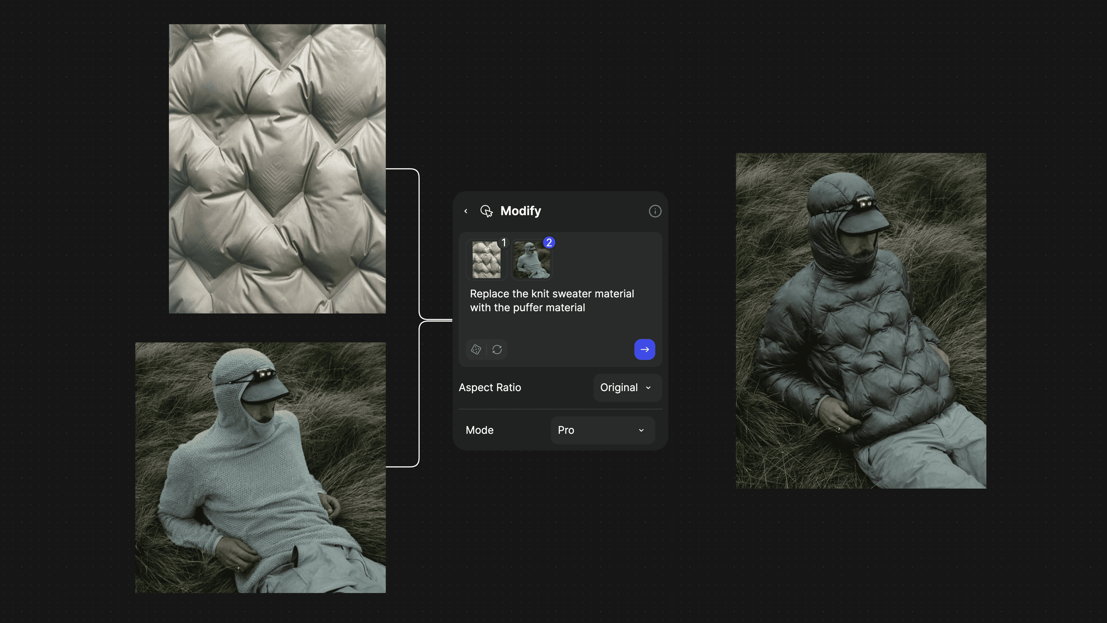Swap materials, colors, or details without rebuilding the whole shot. Tell Modify Pro to “replace the knit sweater with this puffer material,” and it updates just that area while keeping the pose, lighting, and environment exactly the same.